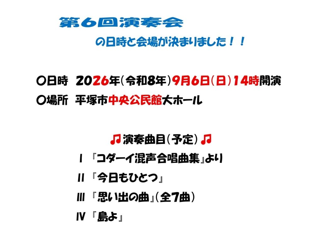残念ながら、大川五郎先生は2020年2月ご逝去されました。その後、新進気鋭の中村拓紀先生が我が団の指揮者として就任してくださいました。先生の熱心なご指導の下、団員も少しずつ増え合唱の表現力も上がってきています。お陰様で2022年の9月19日には、第4回目のコンサートを同年オープンした「ひらしん平塚文化芸術ホール」で開催しました。